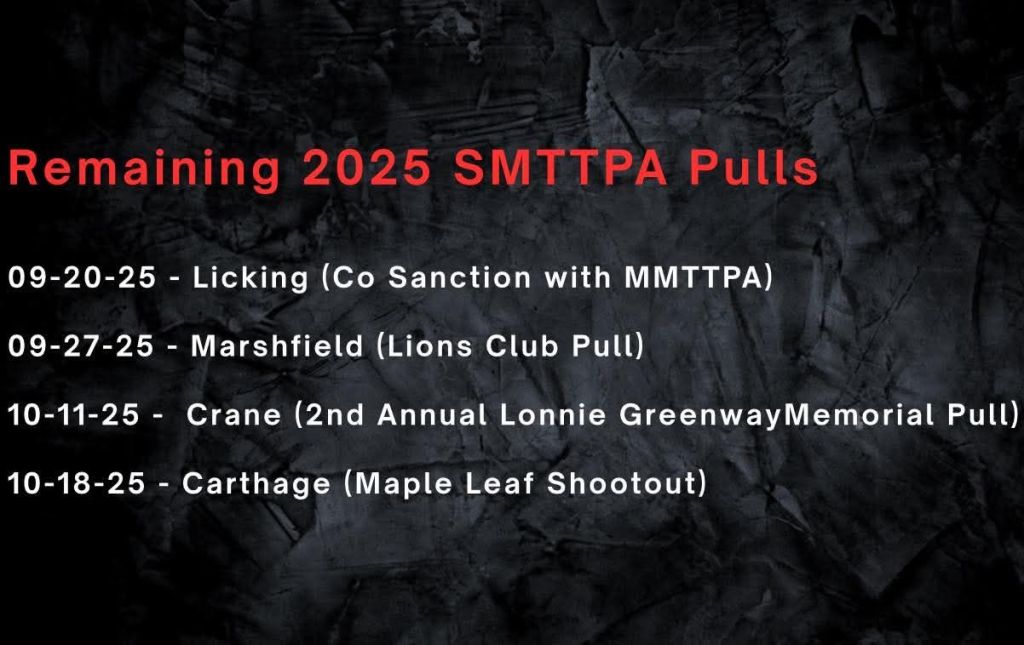 2025 Schedule 2025 Tentative SMTTPA Truck and Tractor Pulling Schedule 🏁 Updated pulling schedule for the remainder of our 2025 season. Share this: Click to share on X (Opens in new window) X Click to share on Facebook (Opens in new window) Facebook Like Loading...